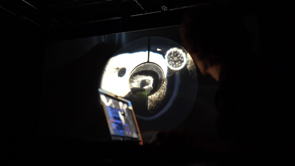 La performance présente également une composante vidéoludique. Manette en main, les participants sont invités à explorer les profondeurs à la manière d’un labyrinthe. Les souterrains y sont représentés sous la forme d’un croquis cartographique tracé à la plume. Que les joueurs et les joueuses préfèrent s’y attarder, à la recherche de passages secrets et de choses sombrées, ou qu’ils/elles soient en quête d’une issue vers la surface, leur cheminement donne à la performance son rythme et sa pulsation – tout comme les trajets successifs inscrivent leur durée et leur mouvement dans le mixage des images. L’exploration y est affaire de seuils – de zones de mutation et de transition, de passages d’un état à un autre – propices au surgissement et à la transformation des images.